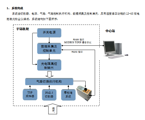 系統(tǒng)由切割器、電源、氣路、氣路控制執(zhí)行機構(gòu)、數(shù)據(jù)采集及控制單元、具有濕度修正功能的LD-6S微電腦激光粉塵儀組成。