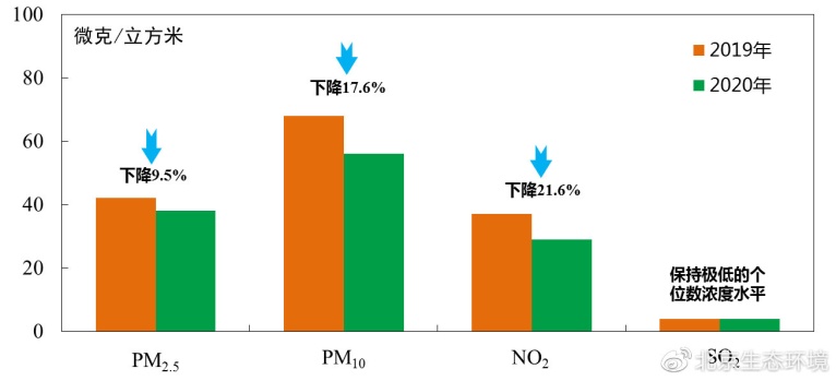 2020年北京市大氣環(huán)境中PM2.5等四項(xiàng)主要污染物同比均明顯改善,其中PM2.5年均濃度為38微克/立方米,首次達(dá)到“30+”水平,同比下降9.5%;可吸入顆粒物(PM10)、二氧化氮(NO2)連續(xù)兩年達(dá)到國家二級標(biāo)準(zhǔn);二氧化硫(SO2)年均濃度穩(wěn)定達(dá)到國家標(biāo)準(zhǔn)并保持個(gè)位數(shù)水平。