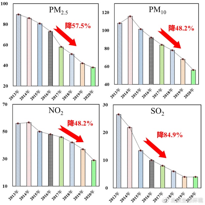 近年來全市主要污染物年均濃度均顯著下降。與2013年相比,2020年大氣四項(xiàng)主要污染物PM2.5、PM10、NO2、SO2分別下降57.5%、48.2%、48.2%、84.9%。