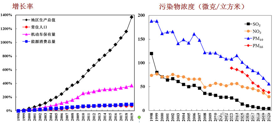 (圖10 1998年以來北京市地區(qū)生產(chǎn)總值、常住人口、機(jī)動(dòng)車保有量、能源消耗總量增速與各項(xiàng)污染物濃度變化趨勢)